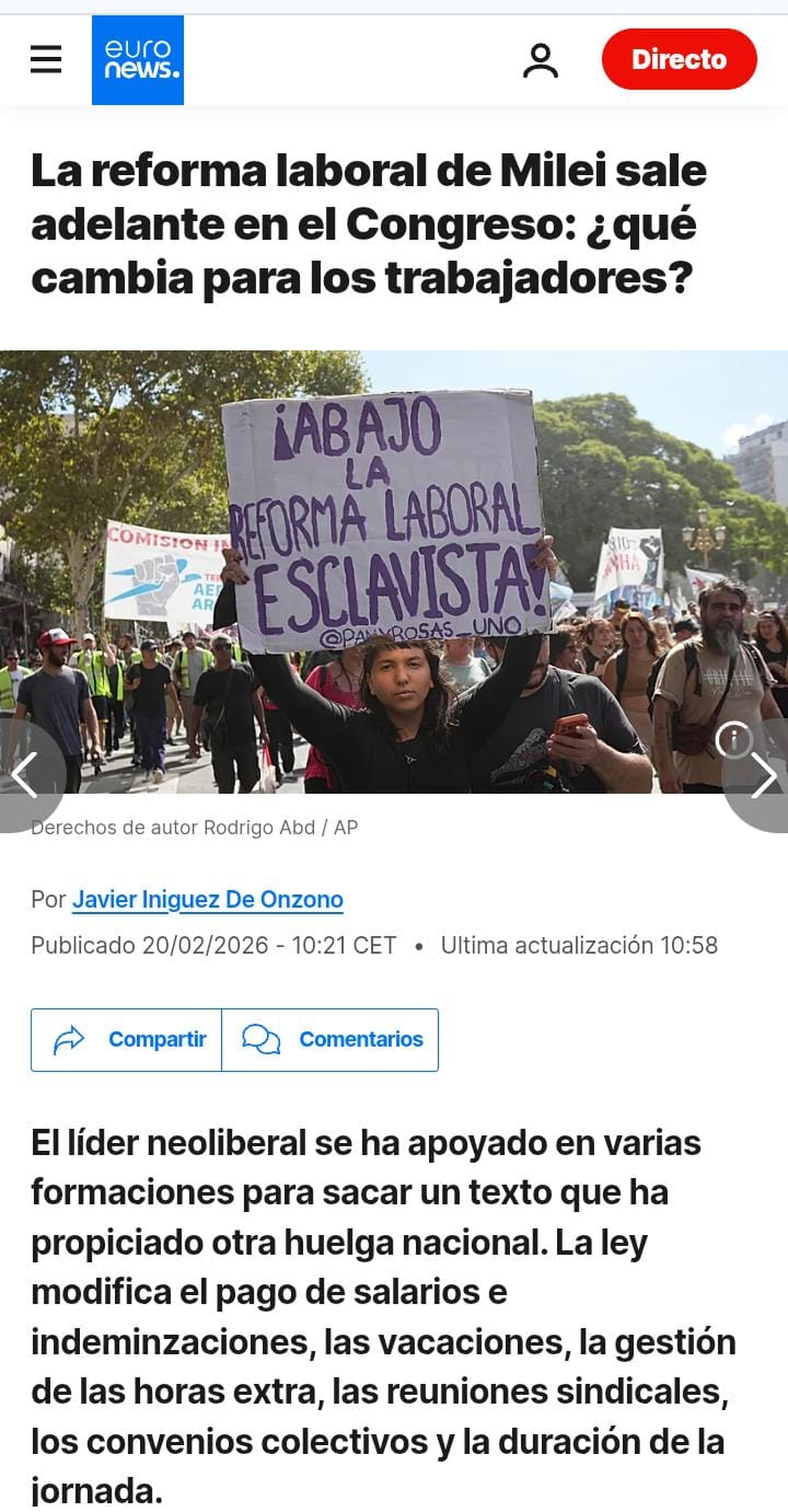 Las principales agencias de noticias del mundo, como Bloomberg, RT y El País, cubrieron la intensa sesión de ayer en el Congreso argentino que debatía el proyecto de ley de la reforma laboral impulsado por Javier Milei, el cual finalmente obtuvo media sanción en Diputados, a pesar de la huelga general y de los grandes disturbios a las afueras del parlamento.