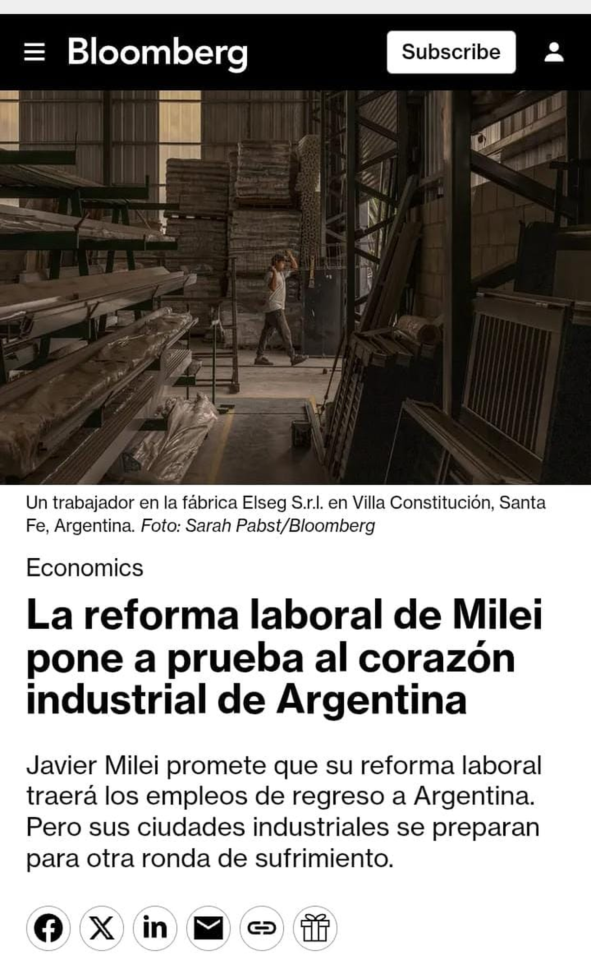 "Javier Milei promete que su reforma laboral traerá los empleos de regreso a Argentina. Pero sus ciudades industriales se preparan para otra ronda de sufrimiento", afirma Bloomberg, poniendo en duda de esta manera a la ley de modernización laboral de Milei, que crearía el Régimen de Incentivo a la Formalización Laboral (RIF), y dudando de que realmente ayude a que miles de trabajadores pasen a ser regularizados al aliviarse la carga fiscal.