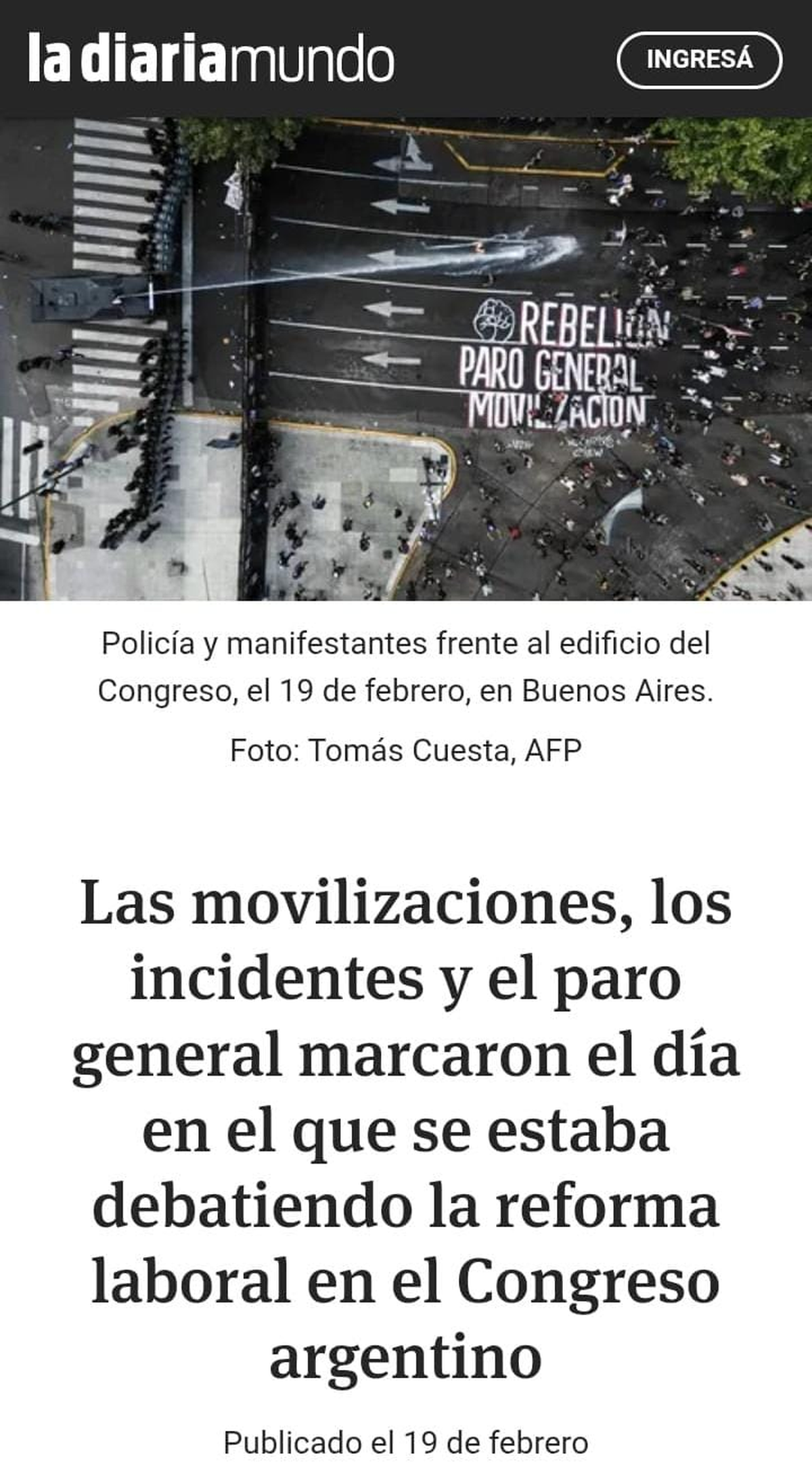 En cuanto a las agencias de noticias de Latinoamérica, el diario uruguayo La Diaria informó sobre los incidentes de ayer al interior del recinto del Congreso argentino y de los disturbios en las afueras, donde miles de manifestantes, congregados por el sindicalismo, se pronunciaron en contra de la reforma laboral, en una jornada signada por el paro nacional convocado por el sindicalismo.