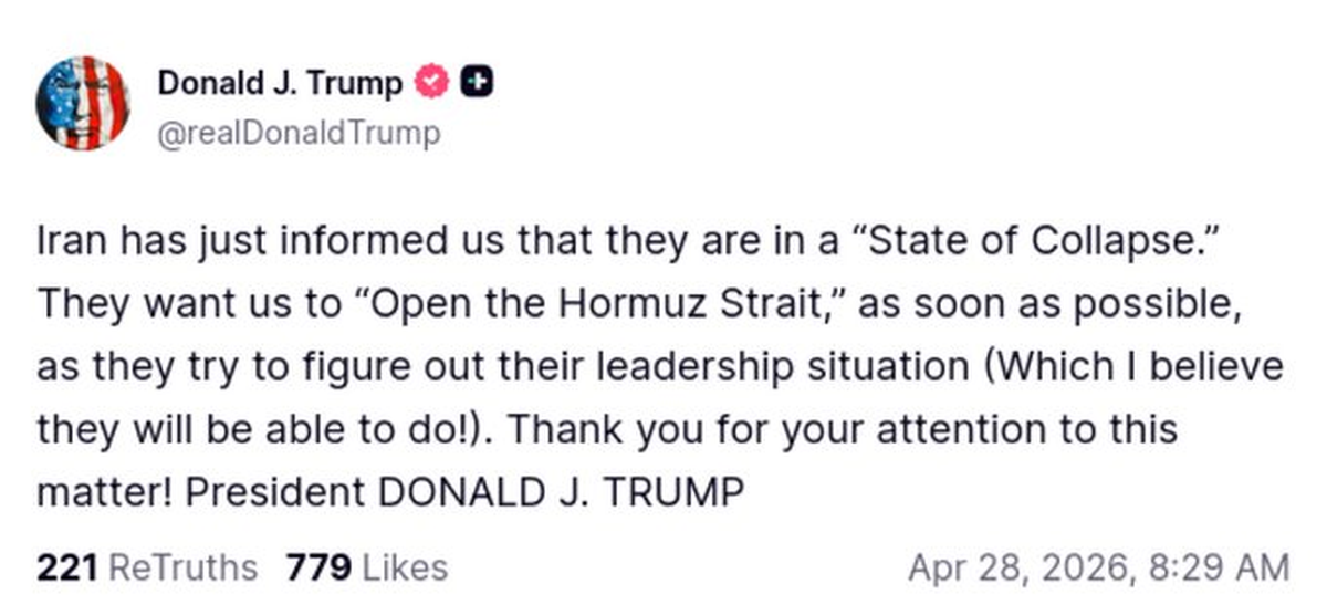 El presidente Donald Trump acaba de postear: "Irán acaba de informarnos que se encuentran en un 'Estado de Colapso'" y "piden reabrir Ormuz".