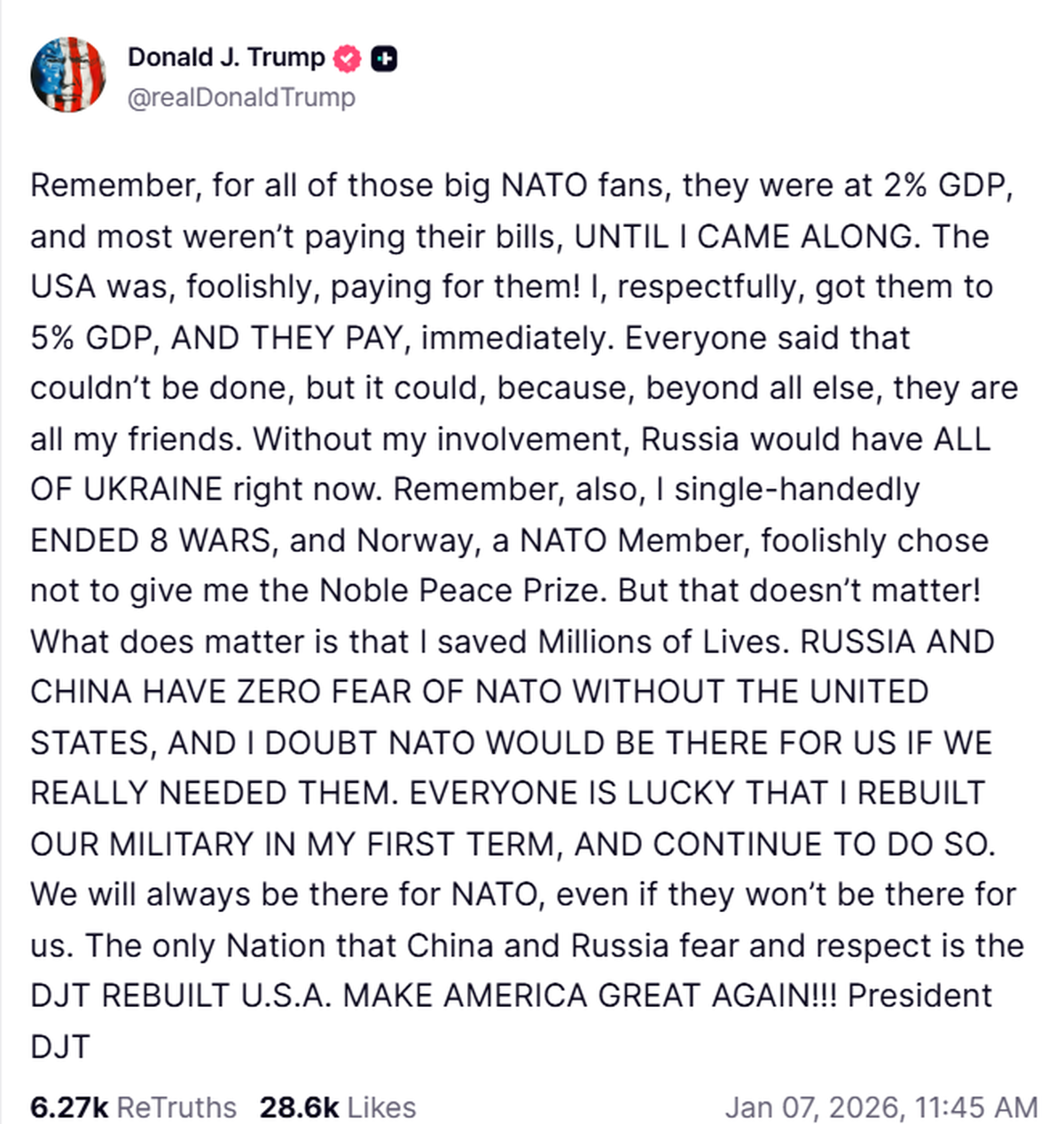 Cabe recordar que Dinamarca, incluida Groenlandia, forma parte de la OTAN, al igual que Estados Unidos. El mensaje de Donald Trump parece sugerir que no quiere pagar por Groenlandia y que la OTAN debería entregársela dado, según su criterio, todo lo que él ha hecho...