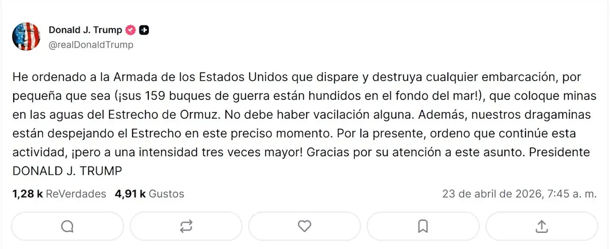 En esa misma jornada de jueves donde increpó a la prensa acredita en la Casa Blanca, Trump, cuyos altos mandos militares están siendo corridos de su cargo o rompiendo filas debido a diferencias con respecto a la guerra, ordenó al Ejército de Estados Unidos “disparar y matar” a cualquier embarcación vinculada a Irán que transite por el estrecho de Ormuz, actualmente bajo bloqueo estadounidense a pesar de la prórroga de dos semanas del alto el fuego con Teherán, en un intento por evitar que buques iraníes sigan minando el lecho submarino.