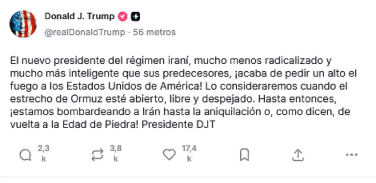 A través de un posteo en su red Truth Social, Trump declaró que el presidente de Irán, Masoud Pezeshkian, le pidió a Estados Unidos un alto al fuego, a pocas horas de que el republicano también dijera que a la guerra le “quedan dos o tres semanas”, lo que puede interpretarse como un manotazo de ahogado debido a los costos políticos y económicos que este frente de guerra le ha resultado al líder del MAGA, ya que varios republicanos rompieron filas con él y debido a que el conflicto ha ocasionado una crisis de suministro global del petróleo.