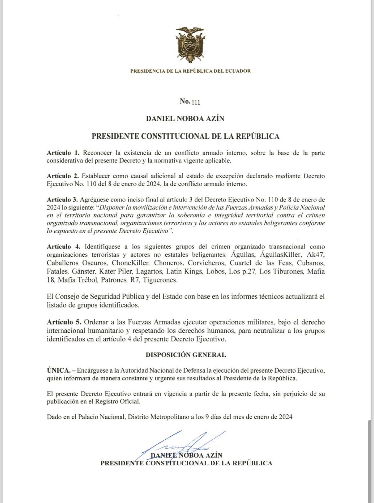 "He firmado el decreto ejecutivo declarando Conflicto Armado Interno e identifiqué a los siguientes grupos del crimen organizado transnacional como organizaciones terroristas y actores no estatales beligerantes: Águilas, ÁguilasKiller, Ak47, Caballeros Oscuros, ChoneKiller, Choneros, Covicheros, Cuartel de las Feas, Cubanos, Fatales, Gánster, Kater Piler, Lagartos, Latin Kings, Lobos, Los p.27, Los Tiburones, Mafia 18, Mafia Trébol, Patrones, R7, Tiguerones".
