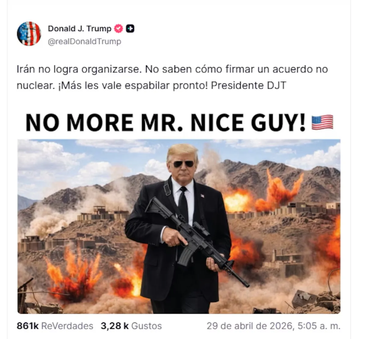 Un día antes, el presidente de los Estados Unidos, Donald Trump, había cuestionado abiertamente a Irán por su persistente negativa a no llegar a un acuerdo de paz en Medio Oriente, según él. En un mensaje en redes sociales, con una gran carga simbólica, Trump escribió unas líneas y compartió una imagen generada con IA en la que aparecóa armado, con gafas de sol oscuras y de espaldas a una escena de devastación post bombardeo.