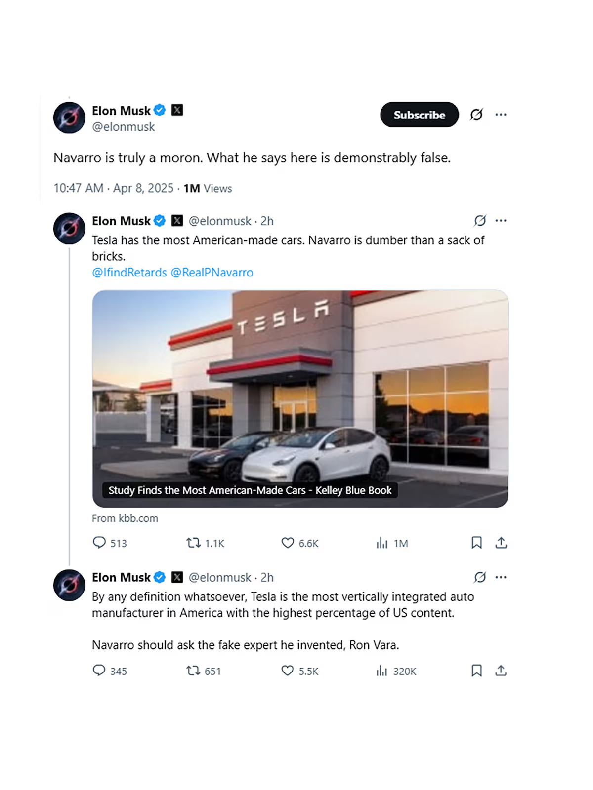 El magnate se cruzó con Peter Navarro, el asesor comercial de la Casa Blanca que lidera la actual política proteccionista de Trump, tras que dijera que no fabrica autos en Tesla sino más bien “ensambla”.