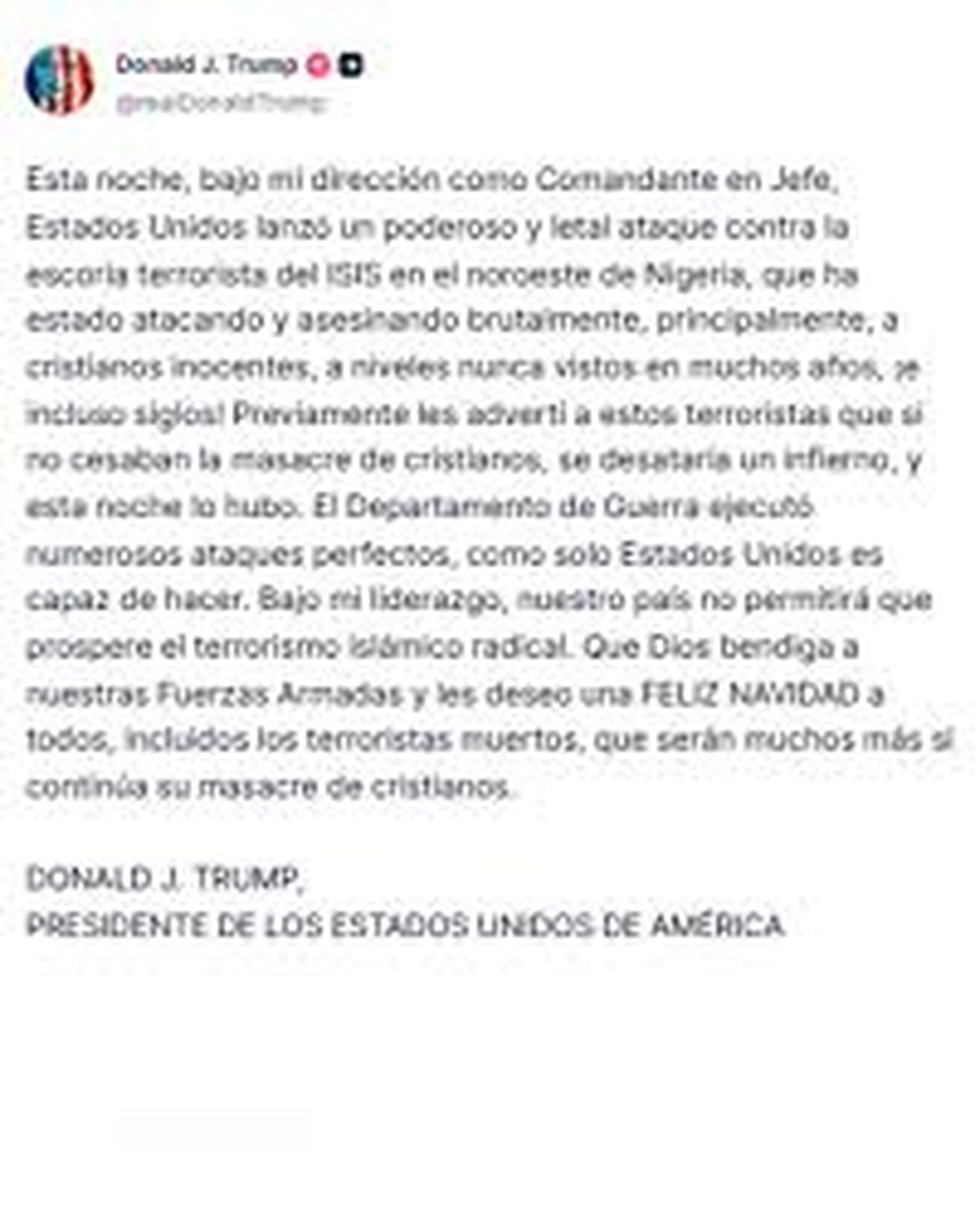 A través de su cuenta en Truth Social, el inquilino de la Casa Blanca reveló en Navidad que ordenó una serie de ataques aéreos contra el El / ISIS en Nigeria debido a que la organización terrorista "ha estado atacando y asesinando brutalmente, principalmente, a cristianos inocentes, a niveles no vistos en muchos años, ¡e incluso siglos!".