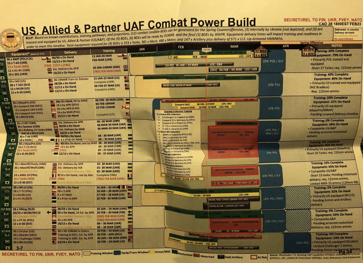 Si la info es verídica, un total de 12 brigadas de la AFU estarían siendo entrenadas y equipadas armamentísticamente por USA para el contrataque, de las cuales 9 están siendo preparadas fuera de Ucrania. El arsenal transferido del exterior a Ucrania, incluye 253 tanques, 381 vehículos de orugas, 480 vehículos de ruedas, 147 sistemas de artillería y 571 vehículos HMMW, así lo refiere la documentación clasificada.