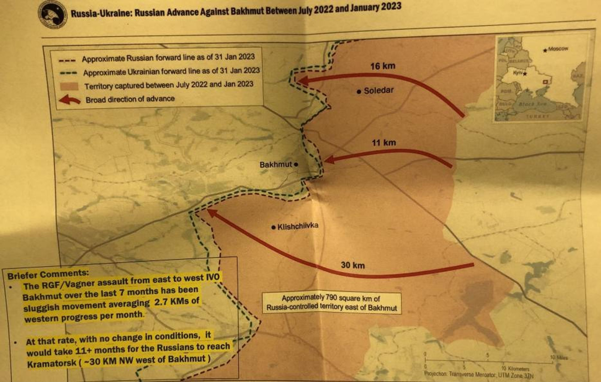 La Inteligencia de los EE.UU. en uno de los archivos clasificados evalúa de manera pesimista los resultados positivos de la ofensiva ucraniana, debido a las deficiencias en el entrenamiento militar y el equipamiento armamentístico de las AFU, por tanto la operación resultaría en “ganancias territoriales menores". Sólo en Bajmut puede obtener victoria por el lento avance de las PMC de Wagner en el área operativa, con un ritmo de solo 2,7 km por mes desde julio de 2022 hasta enero de 2023, provocando que recién en 11 meses llegasen a Kramatorsk.