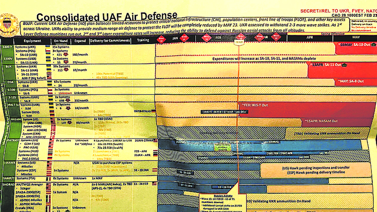 A su vez, uno de los documentos filtrados exhibe que el sistema de defensa aérea de Ucrania se quedará sin misiles guiados antiaéreos para el sistema Buk SAM y los sistemas S-300 a principios de mayo del 2023, quedando desprotegidas al menos 40 instalaciones cruciales.