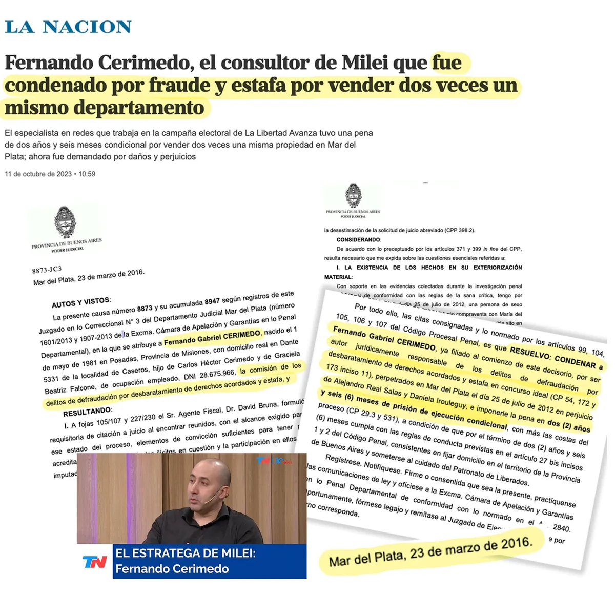 El experto de marketing digital y mano derecha de Milei en redes, Fernando Cerimedo, tiene un prontuario judicial polémico que acaba de salir a la luz. En marzo del 2016 fue condenado a dos años y medio de prisión condicional por el delito de estafa y defraudación por haber vendido dos mismos inmuebles en Mar del Plata.