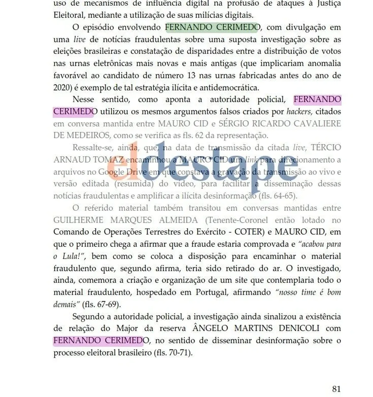 La investigación detalla una "operación de núcleos y cuyos desarrollos volvieron a difundir la narrativa de fraude en las elecciones presidenciales", todo "con el fin de permitir y, eventualmente legitimar una intervención por parte del Fuerzas Armadas, con la abolición violenta del Estado Democrático de Derecho, en dinámica de una verdadera milicia digital, similar al procedimiento ya adoptada por la autodenominada GDO (oficina del odio)".