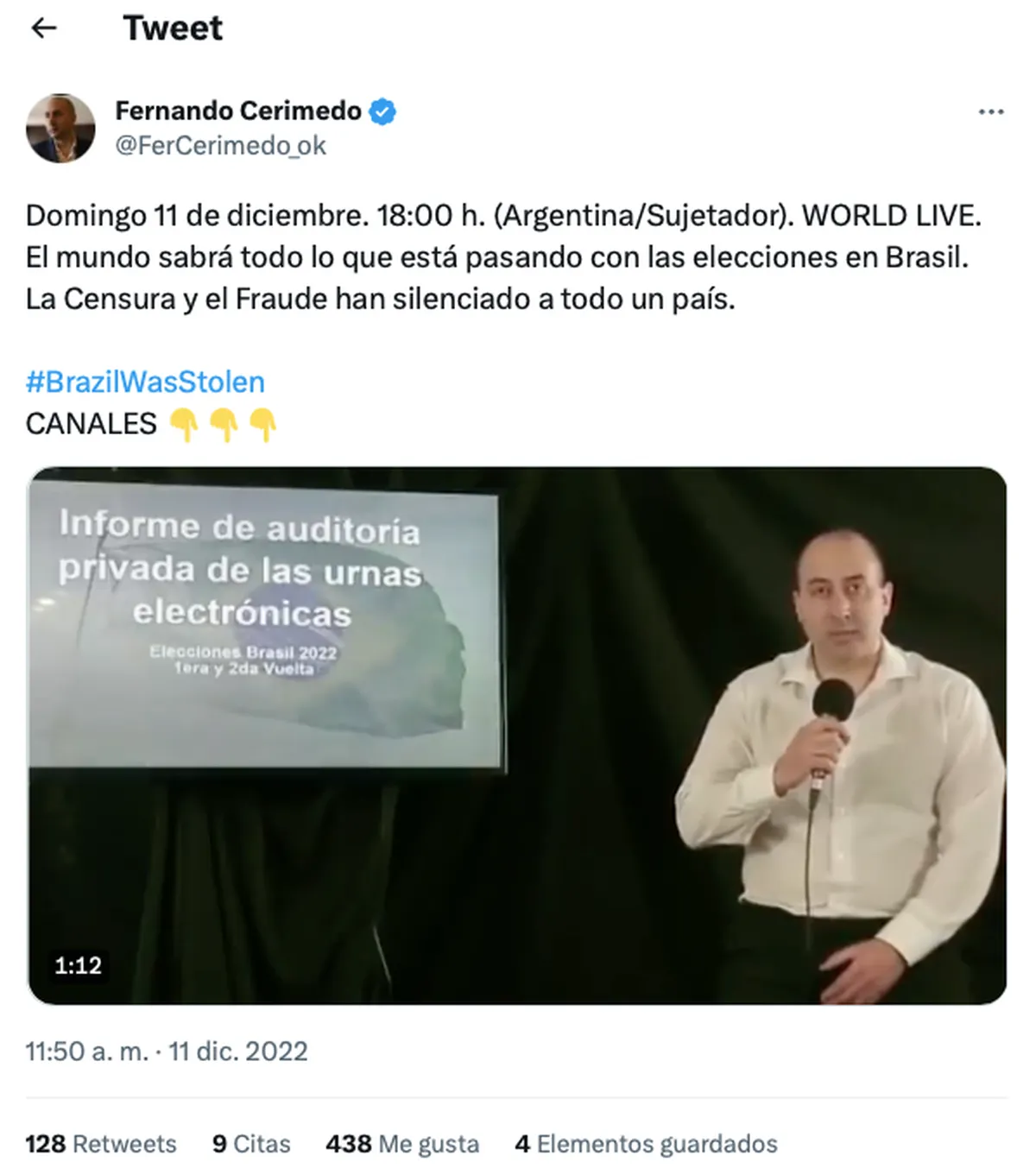 Según evidencia que maneja el Supremo Tribunal Federal de Brasil –antibolsonarista-, pocos días después de la asunción de Lula, Cerimedo publicó un largo video en Youtube en el que denunciaba fraude en las urnas sin ningún tipo de pruebas fehacientes.