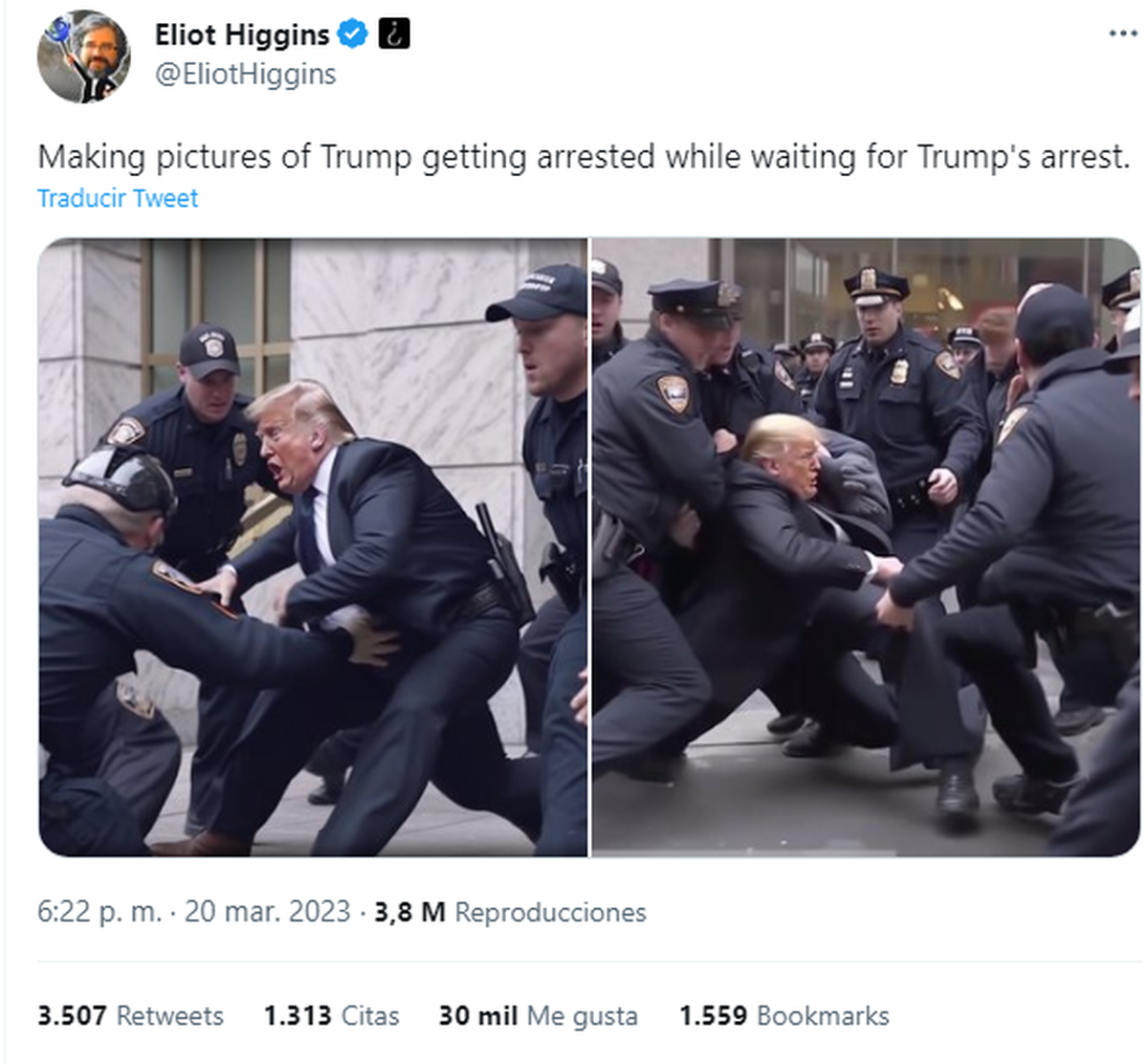 Todo comenzó con un tuit —como la mayoría de los escándalos del siglo XXI—, en el que el Eliot Higgins, periodista, dijo: “Haciendo fotografías de Trump siendo arrestado mientras espera el arresto de Trump ”. Mucho después, en otro tuit, Higgins dijo que en realidad que usó el extraordinario motor gráfico de la inteligencia artificial Midjourney v5 y así generó las imágenes falsas.
