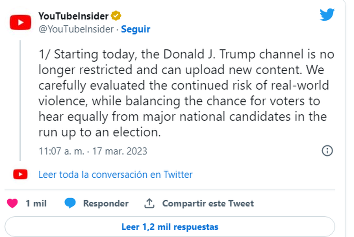 - “A partir de hoy (17 de marzo), el canal de Donald J. Trump ya no está restringido y puede subir contenido nuevo”.