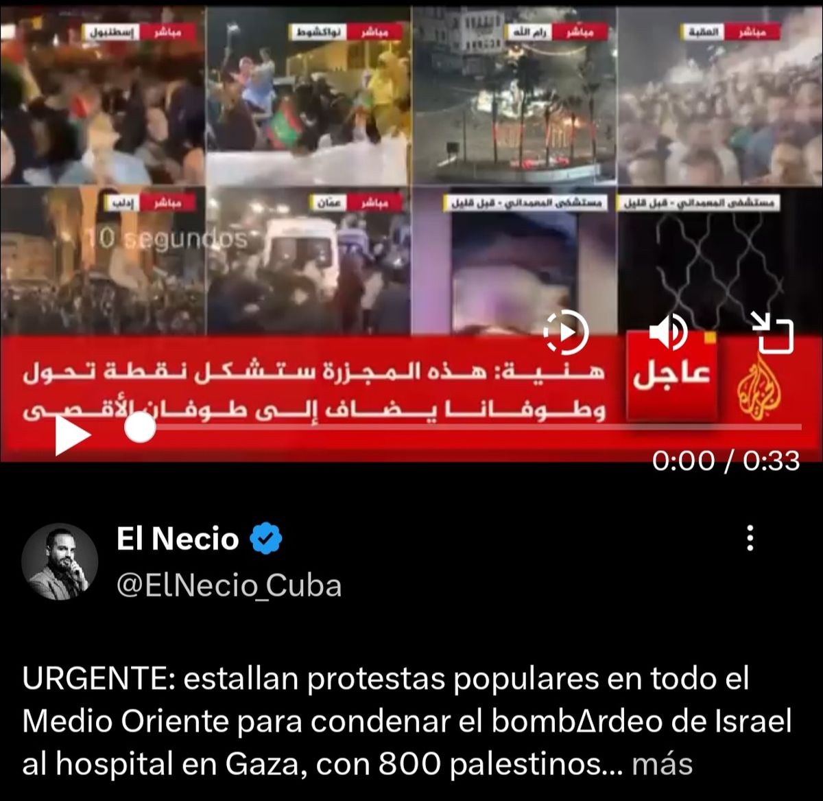 La medianoche de ayer miles de personas del mundo Islam salieron a las calles tras conocerse el bombardeo al hospital de Gaza: protestas en Líbano, Irak, Marruecos, Turquía, Túnez y otras naciones árabes. De hecho, la embajada de Israel en Estambul fue prendida fuego.