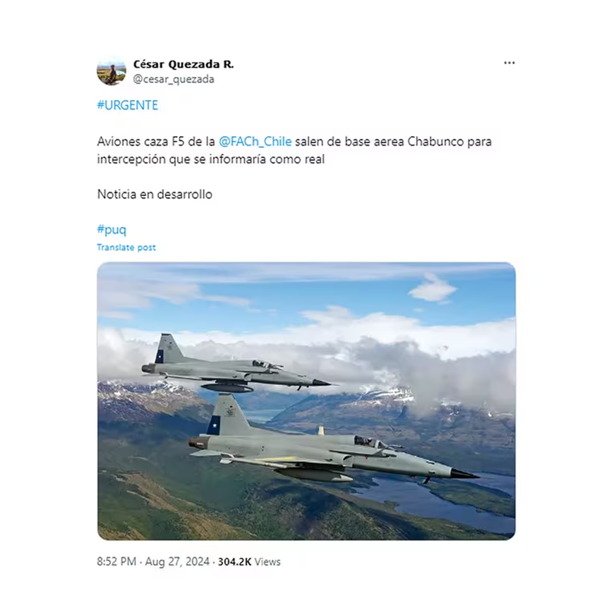 La ministra de Defensa de Chile, Maya Fernández, confirmó este miércoles que la Fuerza Aérea chilena desplegó dos aviones de combate F-5 desde la base aérea de Chabunco, en Punta Arenas, a 3000 km al sur de Santiago, tras que los radares en la zona austral del país andino advirtieran de una incursión aérea no autorizada.