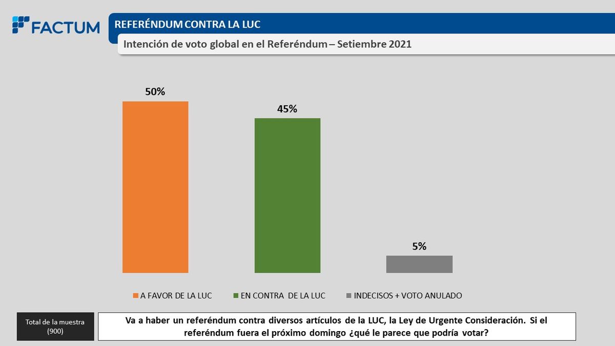 Se estima que este referéndum se lleve a cabo en junio de 2022. La consultora Factum también encuestó sobre este asunto y los resultados son muy parejos: Si el referéndum se llevara a cabo ahora, el 50% votaría a favor, mientras que el 45% de los uruguayos votaría en contra.