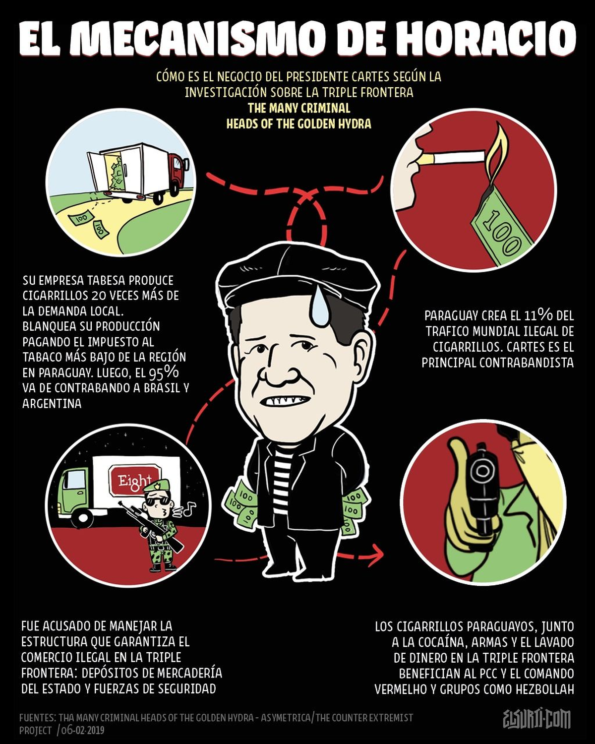 En cuanto al supuesto vínculo de Horacio Cartes con el Hezbollá, según el embajador Marc Osfield de USA, hay pruebas fidedignas de pactos comerciales con los terroristas en términos de que la ruta del contrabando utiliza a menudo la misma que el tráfico de armas y drogas.