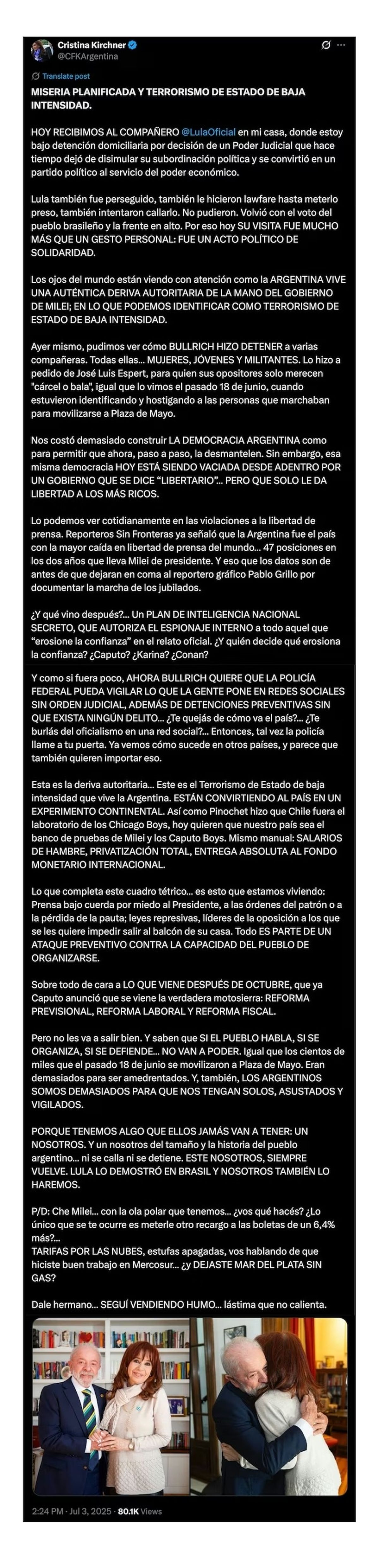 Por ello, tras la reunión, la ex mandataria comparó en sus redes sociales su situación actual con la que vivió el presidente brasilero: “Lula también fue perseguido, también le hicieron lawfare hasta meterlo preso, también intentaron callarlo. No pudieron. Volvió con el voto del pueblo brasileño y la frente en alto. Por eso hoy su visita fue mucho más que un gesto personal: fue un acto político de solidaridad”.