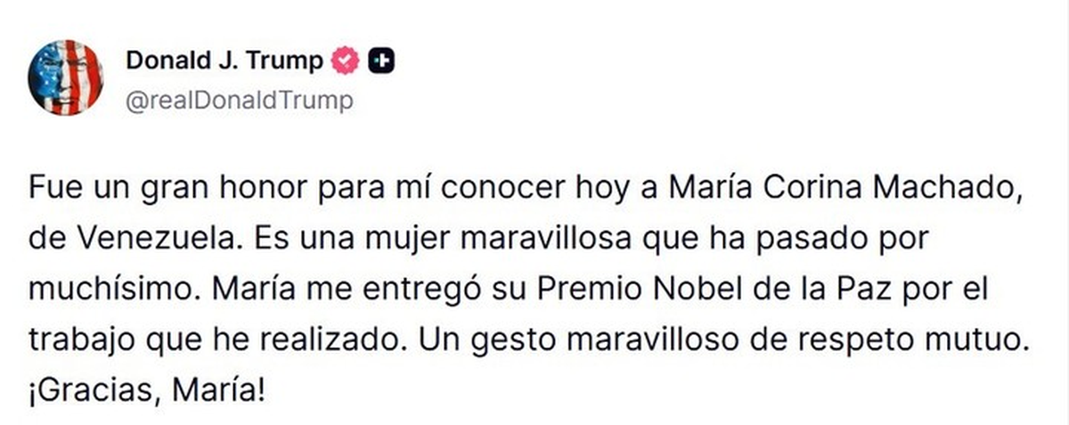 A través de sus redes sociales, el inquilino de la Casa Blanca le agradeció posteriormente a Machado por obsequiarle la medalla de oro de la paz, de 196 gramos de peso y de 6,6 centímetros de diámetro. “Ha sido mi Gran Honor reunirme con María Corina Machado, de Venezuela, hoy. Es una mujer estupenda que ha pasado muchas cosas. María me ofreció su premio Nobel de la Paz por el trabajo que he hecho. Qué gesto tan maravilloso de respeto mutuo ¡Gracias, María!”, escribió este jueves en Truth Social.
