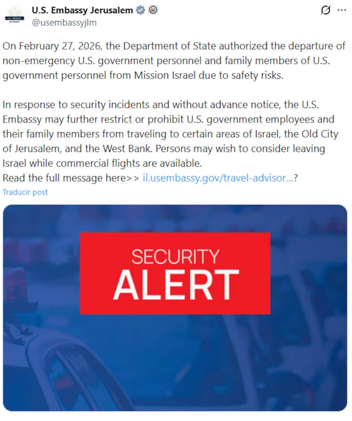 La sede diplomática de EE.UU. en Jerusalén, a través de un comunicado oficial, precisó: "El 27 de febrero de 2026, el Departamento de Estado autorizó la salida del personal del gobierno de los Estados Unidos no esencial y de los familiares del personal del gobierno de los Estados Unidos de la Misión en Israel debido a riesgos para la seguridad. En respuesta a incidentes de seguridad y sin previo aviso, la Embajada de los Estados Unidos puede restringir aún más o prohibir que los empleados del gobierno de los Estados Unidos y sus familiares viajen a ciertas zonas de Israel, la Ciudad Vieja de Jerusalén y Cisjordania. Las personas pueden considerar salir de Israel mientras haya vuelos comerciales disponibles".
