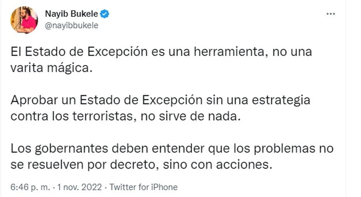 La primera vez que el legislativo, con mayoría oficialista (Nuevas Ideas), aprobó el estado de excepción (27/03/22) fue luego de la ola de homicidios con sello narco -entre el 25 y 27 de marzo- que puso fin a la falacia de paz producto de las negociaciones secretas entre la Administración de Bukele y las bandas criminales como Mara Salvatrucha (MS-13), Barrio 18 Sureños y Barrio 18 Revolucionarios, según lo develó el medio digital salvadoreño El Faro.