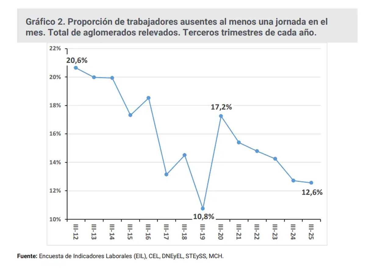 El argumento oficial apunta a reducir litigiosidad, combatir abusos y generar condiciones para contratar más en blanco en un país donde el empleo informal es un problema estructural. Sin embargo, los datos de la Secretaría de Trabajo muestran que el ausentismo está en niveles mínimos históricos, con un 12,6% de la dotación mensual ausente en promedio, y que más de la mitad de esas ausencias (50,5%) se deben a enfermedad, con lo cual la idea de un sistema desbordado por licencias injustificadas carece de fundamentos.