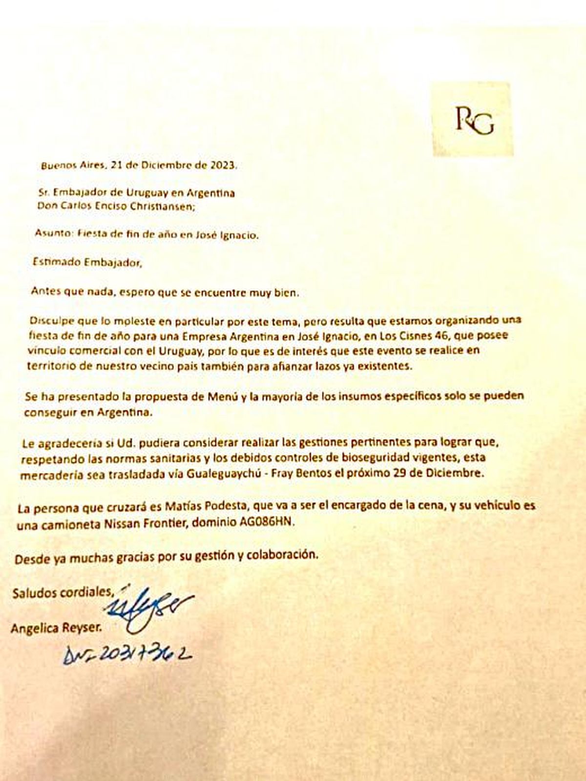 De acuerdo a la documentación existente, el "pedido del ingreso de insumos comestibles de difícil acceso en el mercado local", fue presentado por Angélica Reyser. El objetivo informado fue "una actividad de despedida de año realizada por una empresa que mantiene vínculos comerciales con nuestro país". Ella aparece responsable de servicios de contabilidad, auditoría y análisis fiscal.