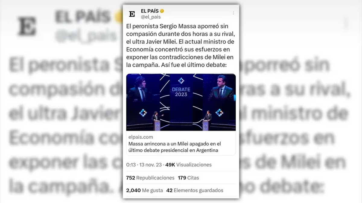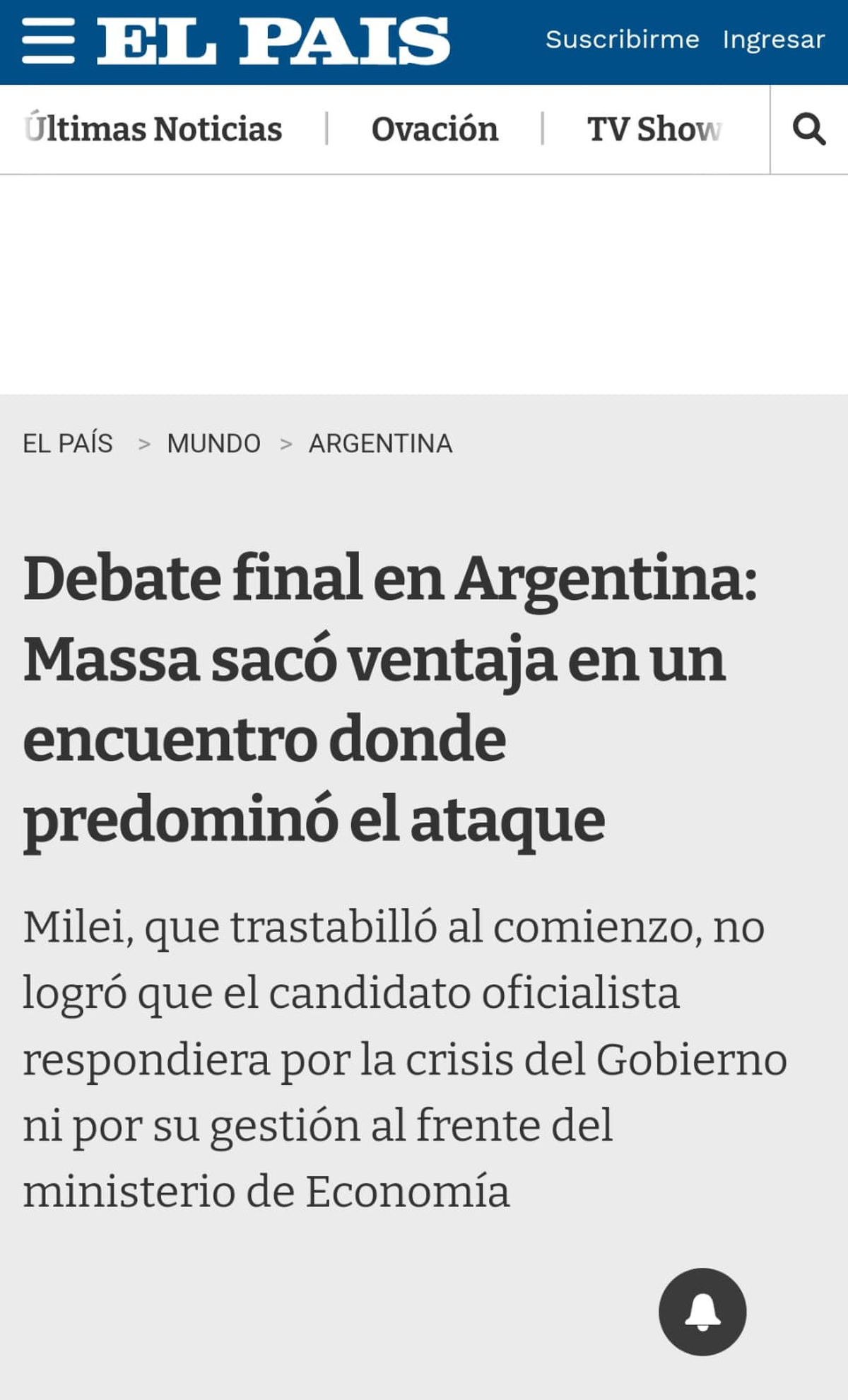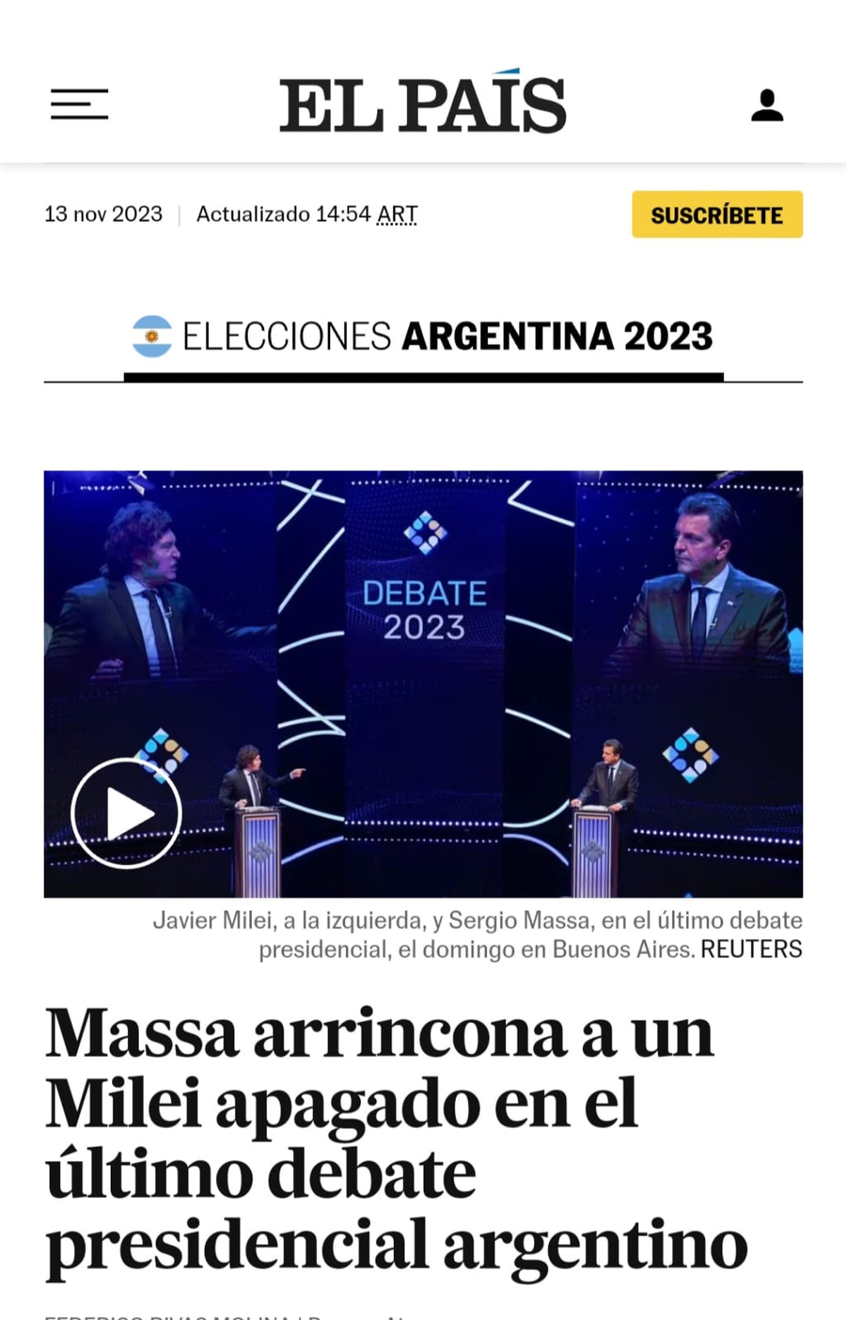 Contrariamente a la visión de El Mundo, el otro diario de España, El País, puso en su titular: “Massa arrincona a un Milei apagado en el último debate presidencial argentino”.