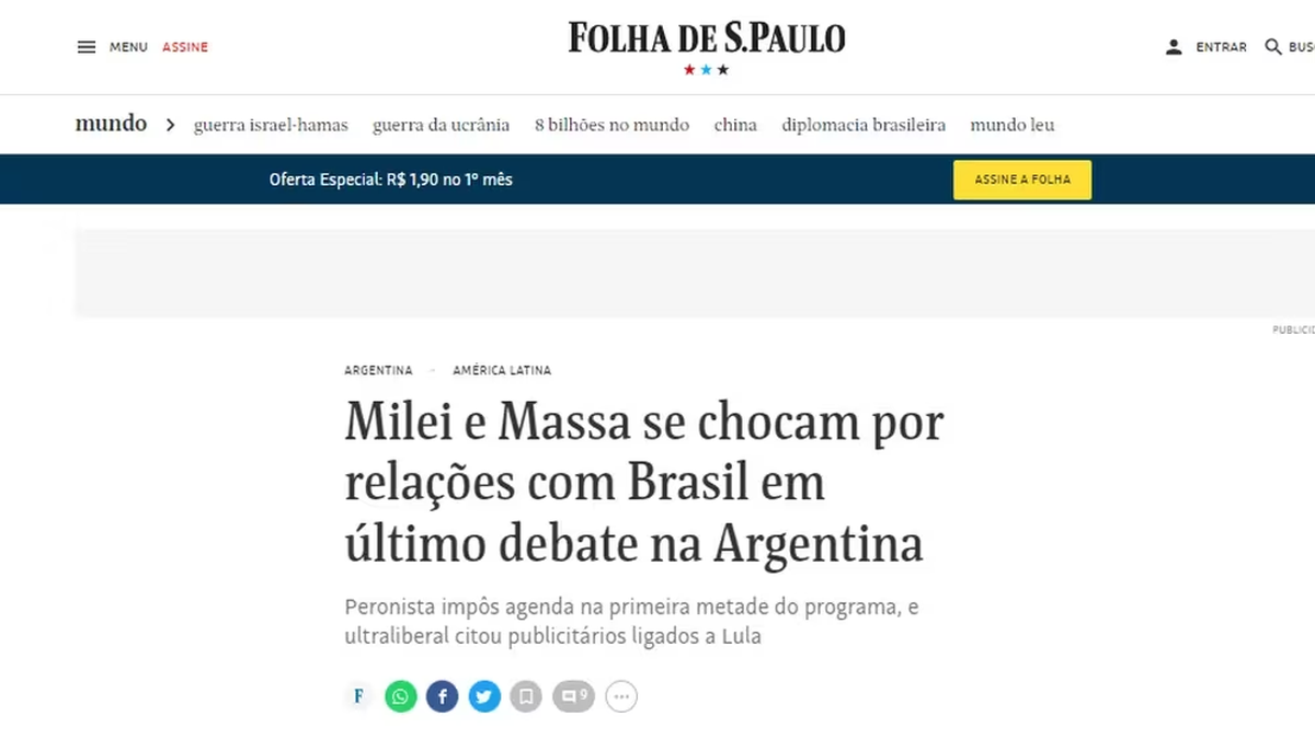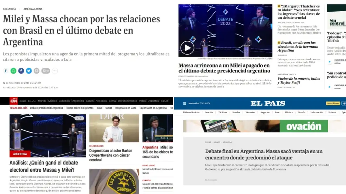 En cuanto a la prensa de Brasil, el diario Folha escribió en su encabezado “Milei y Massa chocan por las relaciones con Brasil en el último debate en Argentina”. También refirió a que “los peronistas impusieron una agenda en la primera mitad del programa y los ultraliberales citaron a publicistas vinculados a Lula”.