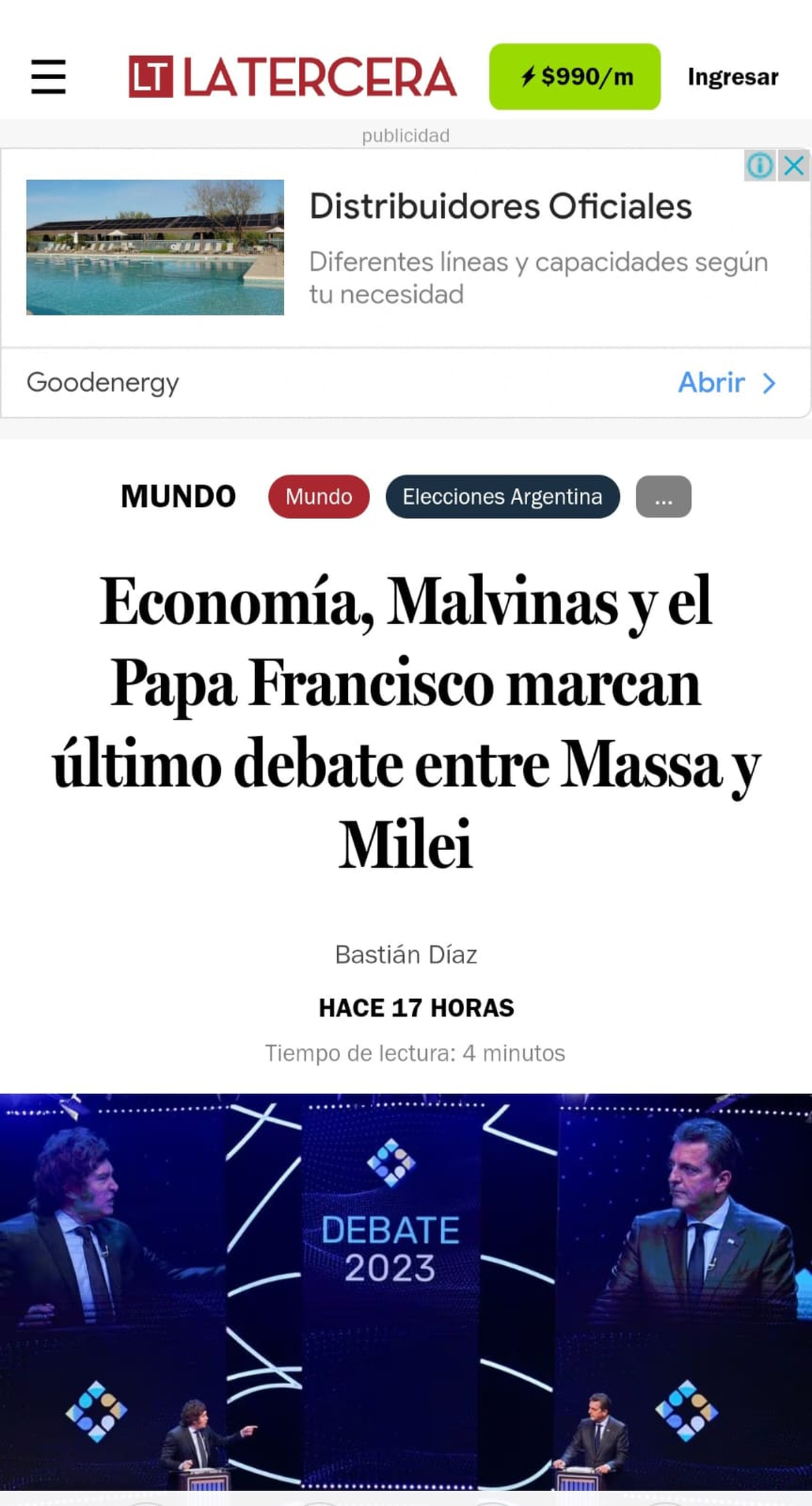 El país andino fue otro que habló del debate presidencial. Así, el diario chileno La Tercera tituló “Economía, Malvinas y el Papa Francisco marcan último debate entre Massa y Milei”, además de enfatizar que los sondeos actuales dan un cierto empate técnico.