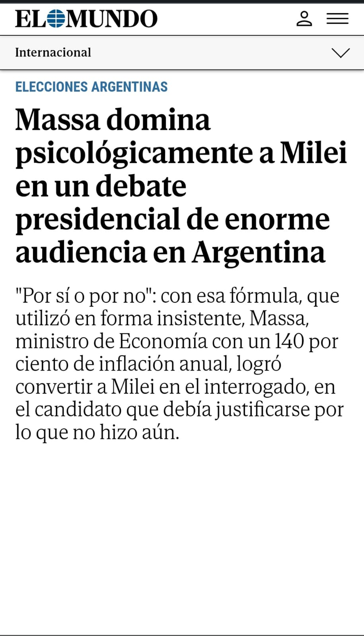 Por otro lado, el diario español El Mundo visibilizó que Massa ejerció una cierta dominación en la psiquis de Milei. “Massa domina psicológicamente a Milei en un debate presidencial de enorme audiencia en Argentina”, tituló tal diario.