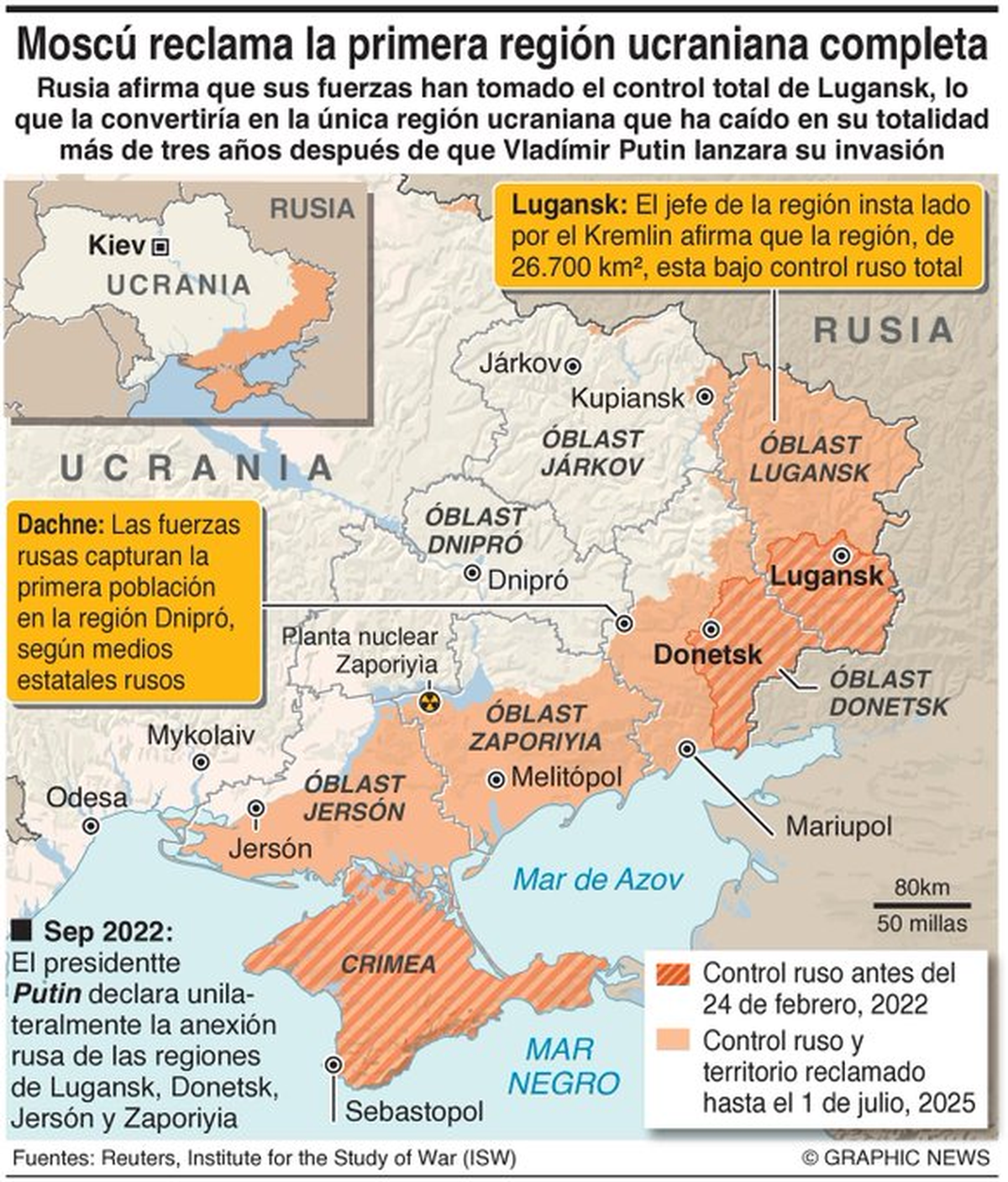 El dirigente de la República Popular de Lugansk aseguró este lunes que las fuerzas rusas controlan “completamente” la provincia que reclaman los rusófonos como propia; es decir, una de las regiones —junto con Donetsk, Jersón y Zaporiyia— anexadas en 2022 por Rusia a través de cuestionados plebiscitos, que se suma a la de Crimea en 2014.