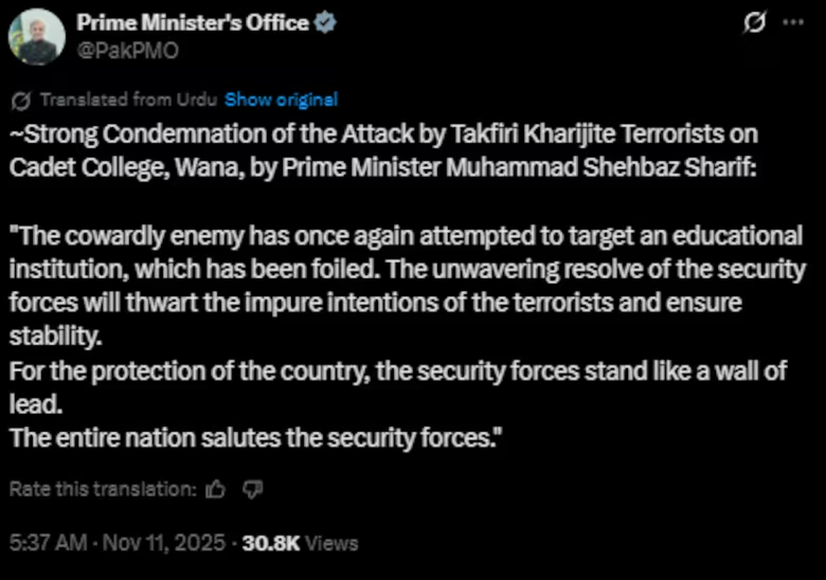 Del mismo modo, en la misma jornada, otros atacantes, pertenecientes al grupo Tehreek-e-Taliban Pakistan (TTP), trataron de irrumpir en el recinto académico del colegio militar Cadet College Wana, ubicado en una zona tribal del distrito de Waziristán del Sur, en la provincia de Khyber Pakthunkhwa, cerca de la frontera afgana. Tres atacantes logarron ingresar al recinto, en el que había unas 650 personas, entre ellas 525 cadetes. “La evacuación de los cadetes avanza gradualmente”, informaron las autoridades en esta mañana, precisando que la operación continuaba con la máxima precaución para garantizar la seguridad de los cadetes y que no finalizaría hasta que “el último militante sea eliminado”.