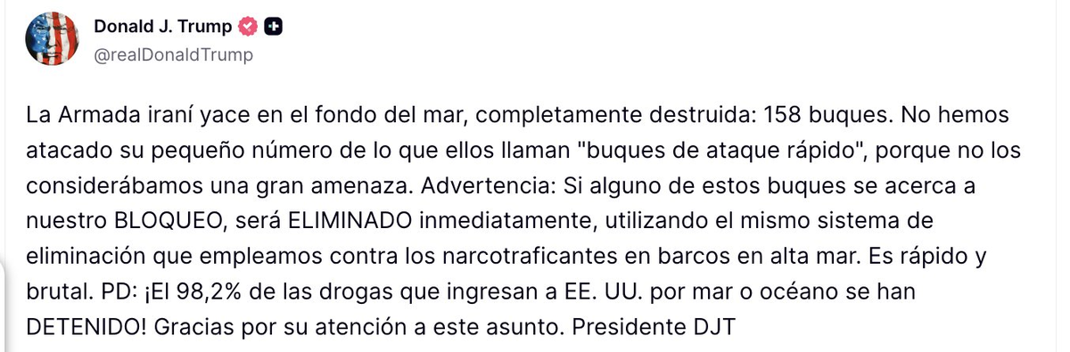 “Advertencia: si alguno de estos barcos se acerca en lo más mínimo a nuestro BLOQUEO, será ELIMINADO de inmediato", escribió Trump en su plataforma Truth Social, en mayúsculas. Agregó que el resto de la Armada iraní había sido "completamente aniquilada" y dijo que las fuerzas estadounidense utilizarán “el mismo sistema de eliminación” empleado “contra los narcotraficantes en barcos en alta mar”, en referencia a los ataques aéreos contra presuntas embarcaciones de narcotraficantes en el Caribe y el Pacífico.