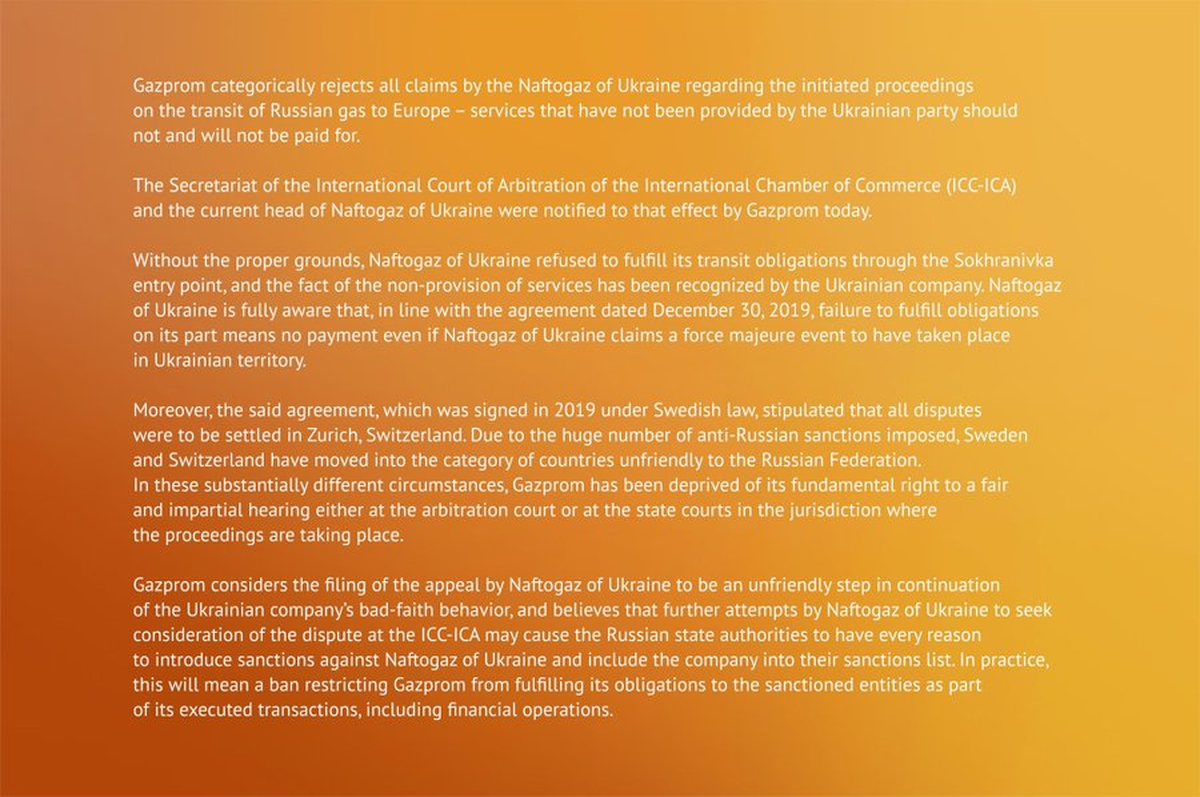 Naftogaz es muy consciente de que, según el acuerdo del 30 de diciembre de 2019, el incumplimiento de su parte significa que no hay pago, incluso si Naftogaz reclama un evento de fuerza mayor en el territorio de Ucrania. Además, el acuerdo especificado, celebrado en 2019 bajo la ley sueca, determinó a Zurich en Suiza como el lugar para resolver las disputas de las partes. Gracias a la gran cantidad de sanciones contra Rusia impuestas, Suecia y Suiza han pasado a la categoría de países hostiles a la Federación Rusa. El cambio significativo de las circunstancias priva a Gazprom del derecho fundamental a una audiencia justa e imparcial, tanto en el propio arbitraje como en los tribunales estatales en el lugar de su celebración”, concluyó la empresa rusa.