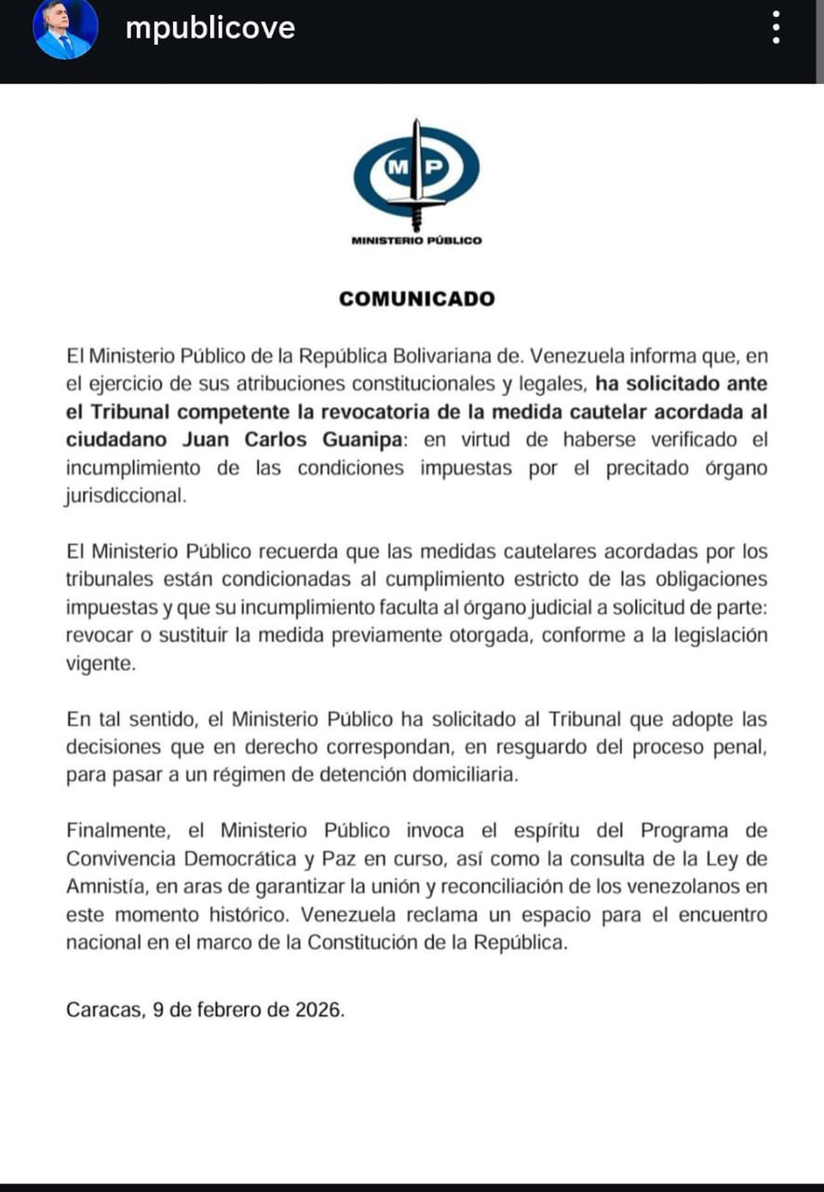 La Fiscalía venezolana, a cargo del chavista de línea dura Tarek William Saab, aseguró este lunes que solicitó ante un tribunal revocar "la medida cautelar (excarcelación) acordada al ciudadano Juan Pablo Guanipa" por, supuestamente, "haberse verificado el incumplimiento de las condiciones" impuestas por las autoridades judiciales, en alusión a sus declaraciones públicas. Esto marca un cisma dentro del régimen chavista, entre los pro-maduristas fundamentalistas y los más conciliadores, como los hermanos Rodríguez, quienes han acordado con la Casa Blanca, enfrentándose a Diosdado Cabello y Vladimir Padrino López.