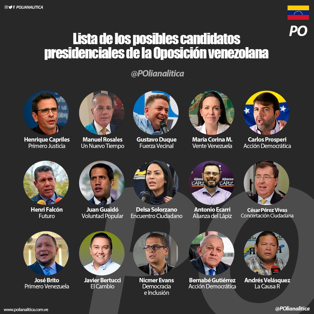 Las primarias de la Oposición agrupada en Plataforma Unitaria serán el próximo 22 de octubre, liderando las encuestas el candidato y ex detenido Henrique Capriles de Voluntad Popular (24,8 %), seguido de la ex diputada María Corina Machado de Vente Venezuela(19,2%) y el humorista Benjamín Rausseo conocido como ‘El Conde del Guácharo’(14,8%), según sondeo de Consultores 21.