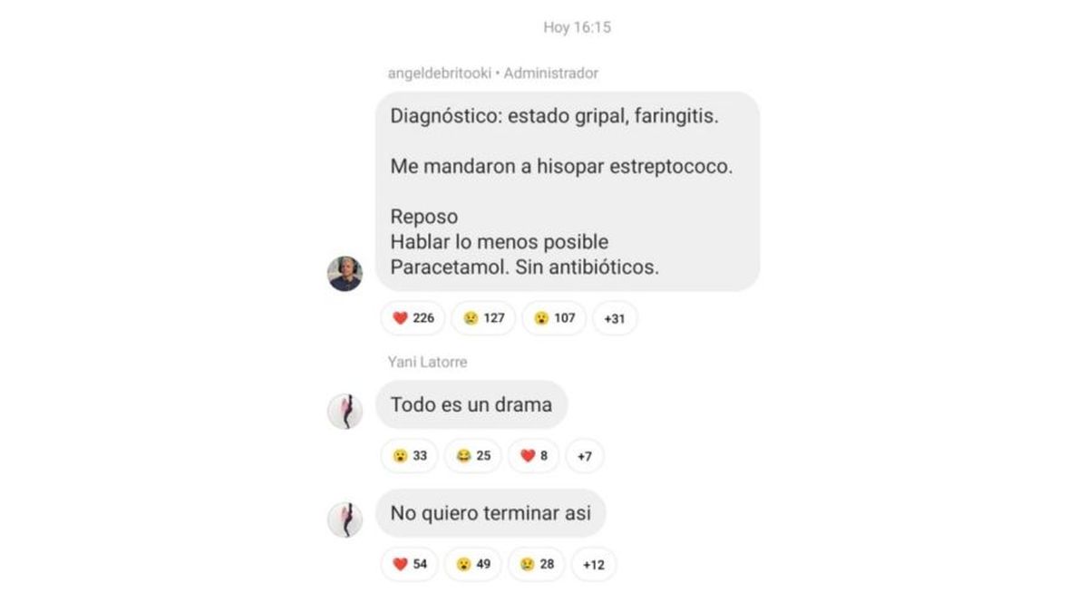 “Estado gripal, faringitis. Me mandaron a hisopar estreptococo. Reposo, hablar lo menos posible. Paracetamol, sin antibióticos", añadió Ángel de Brito. El mismo tiene un fuerte dolor que no lo deja vivir con normalidad.