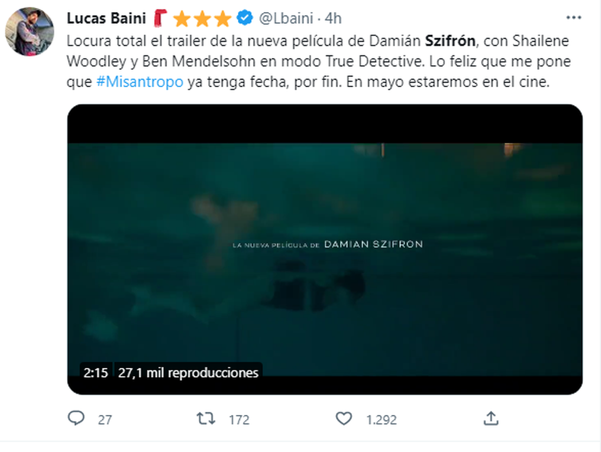 "Locura total el trailer de la nueva película de Damián Szifrón, con Shailene Woodley y Ben Mendelsohn en modo True Detective. Lo feliz que me pone que #Misantropo ya tenga fecha, por fin. En mayo estaremos en el cine."