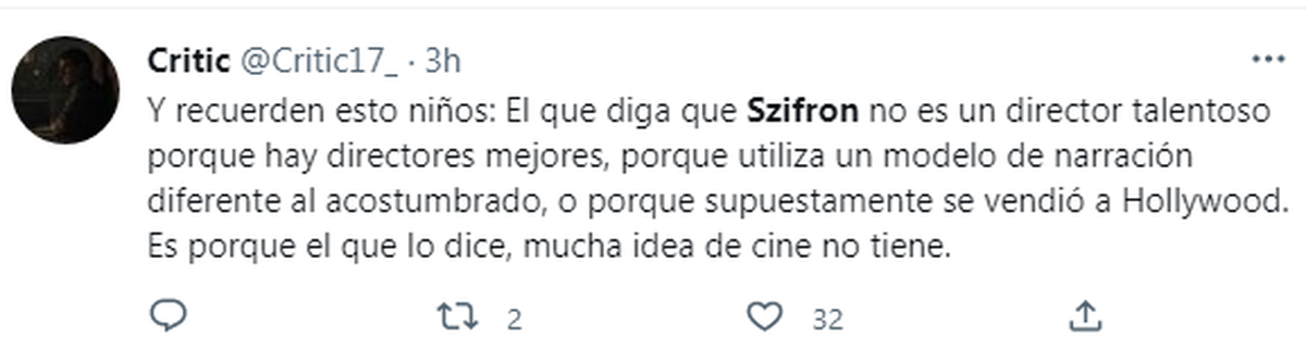 "Y recuerden esto, niños: El que diga que Szifron no es un director talentoso porque hay directores mejores, porque utiliza un modelo de narración diferente al acostumbrado, o porque supuestamente se vendió a Hollywood. Es porque el que lo dice, mucha idea de cine no tiene."