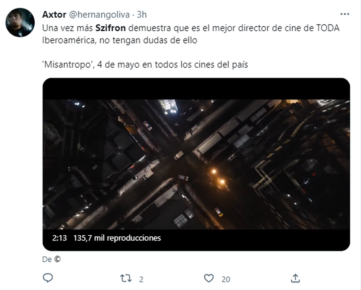 "Una vez más Szifron demuestra que es el mejor director de cine de TODA Iberoamérica, no tengan dudas de ello 'Misantropo', 4 de mayo en todos los cines del país."