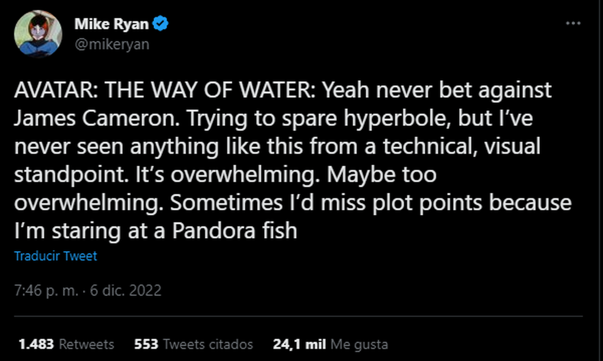 “Sí, nunca apuestes contra James Cameron. Tratando de evitar la hipérbole, pero nunca había visto algo así desde un punto de vista técnico y visual. es abrumador. Tal vez demasiado abrumador. A veces me pierdo los puntos de la trama porque estoy mirando un pez Pandora” tuiteó Mike Ryan un periodista del medio norteamericano Uproxx.