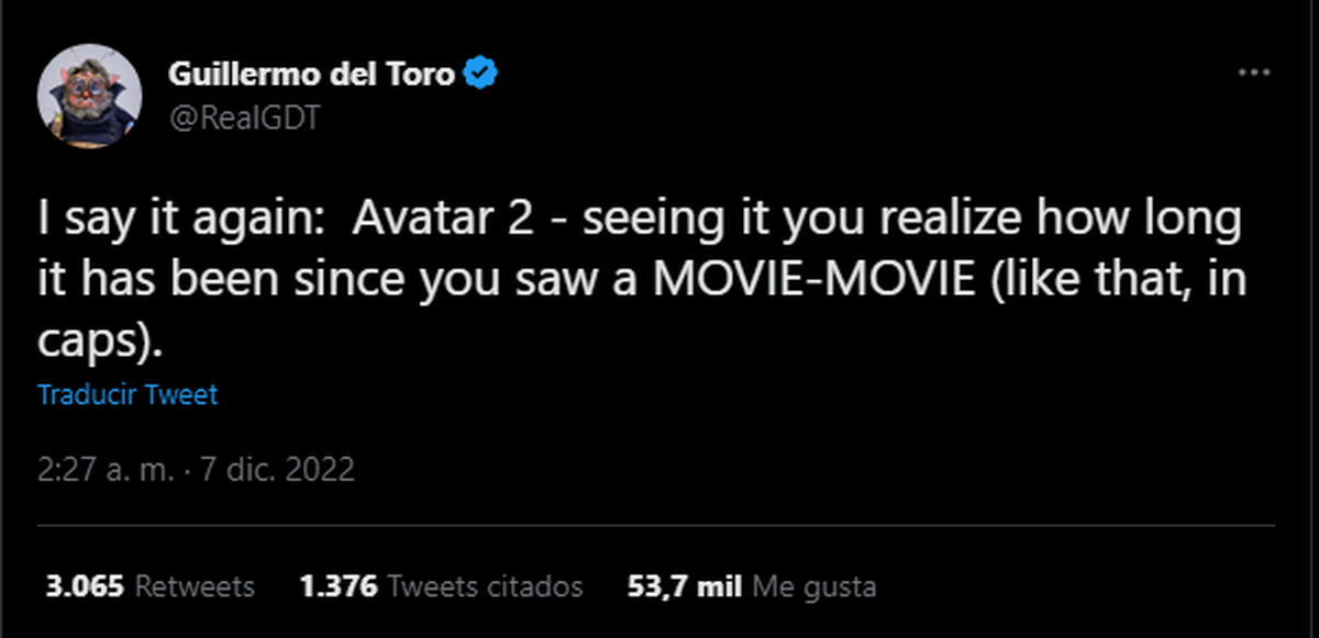 Guillermo del Toro, ganador del Oscar, escribió en Twitter que la secuela de Avatar es “Un logro asombroso. Está repleta de tomas y emociones majestuosas a una escala épica, muy épica. Es la muestra de un maestro en la cima de su poder”.