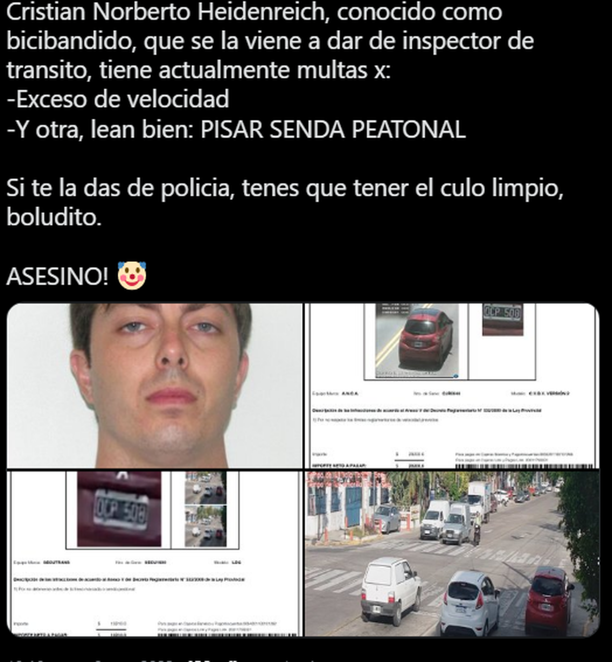 Por si el asunto no fuera menor, y en medio de tanta incertidumbre sobre quién está atrás del ya dudoso personaje de Bicibandido, en Twitter se filtró información sobre su vida privada. Su nombre de pila sería Cristian Norberto Heidenreich y actualmente poseería dos multas. Una por exceso de velocidad y otra por, qué ironía, pisar senda peatonal.