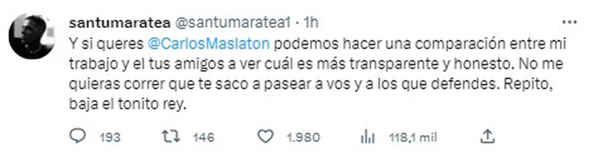 "Y si queres @CarlosMaslaton podemos hacer una comparación entre mi trabajo y el tus amigos a ver cuál es más transparente y honesto. No me quieras correr que te saco a pasear a vos y a los que defendes. Repito, baja el tonito rey." cerró Maratea, totalmente sacado.