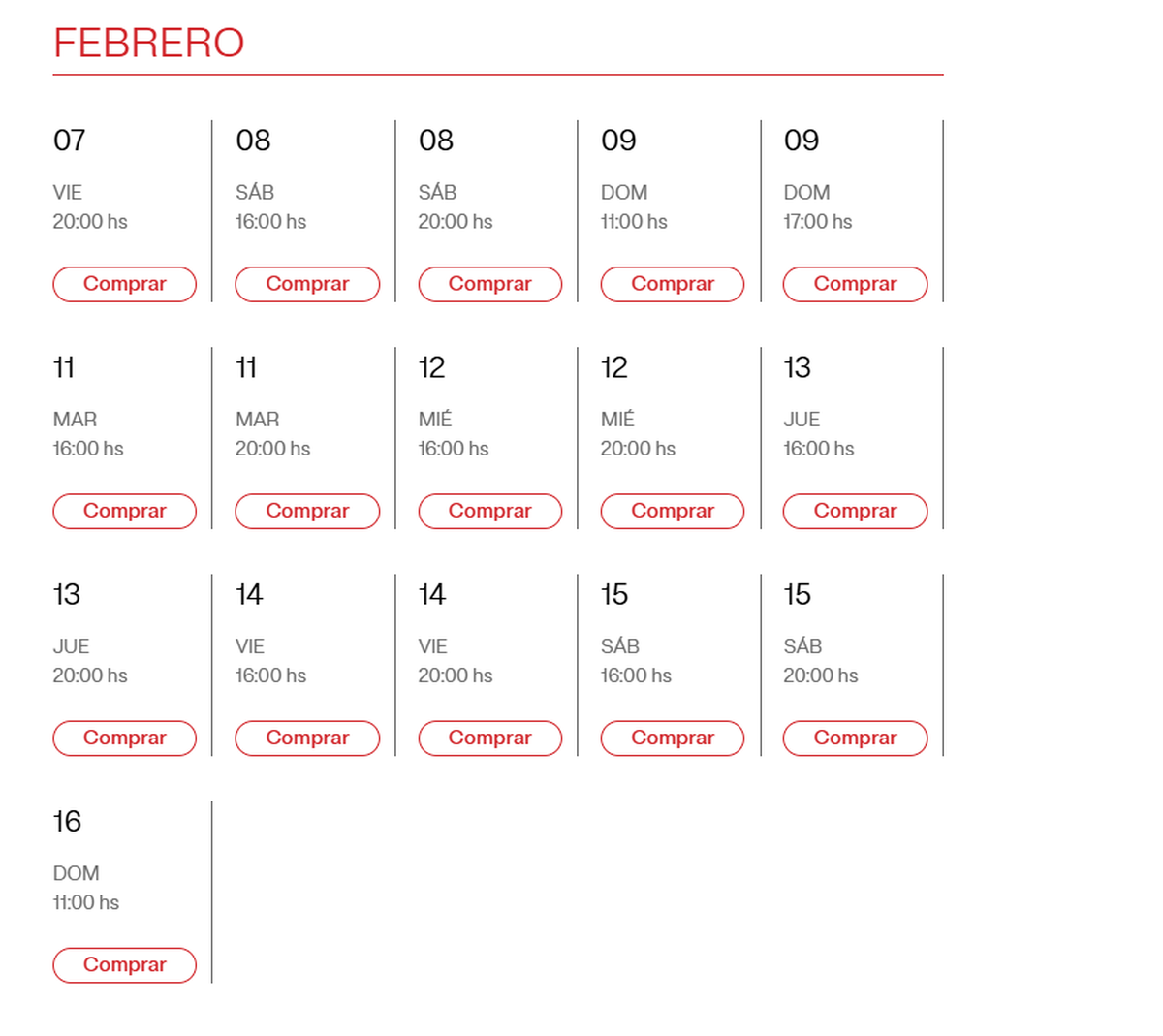 Las funciones serán del 7 al 16 de febrero, en distintos horarios. Dependiendo el día habrá funciones a las 11.00, 16.00, 17.00 horas o por la noche, a las 20.00 horas.
