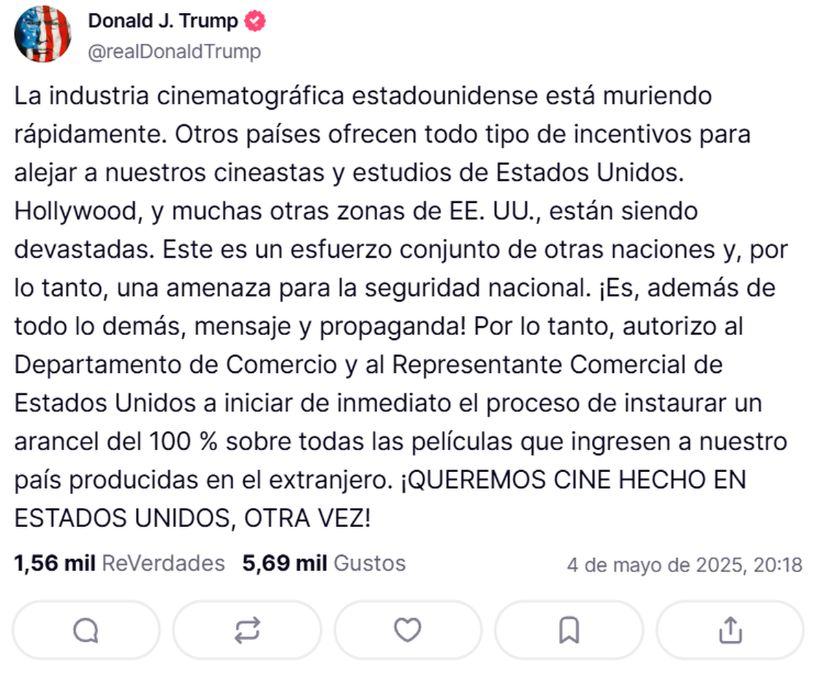 "Otros países ofrecen todo tipo de incentivos para alejar a nuestros cineastas y estudios de Estados Unidos. Hollywood y muchas otras zonas están siendo devastadas", expresó el presidente en su cuenta oficial. Pero lo que más llamó la atención fue su justificación: catalogó esta situación como "una amenaza para la seguridad nacional" y calificó a las producciones extranjeras como "mensaje y propaganda".