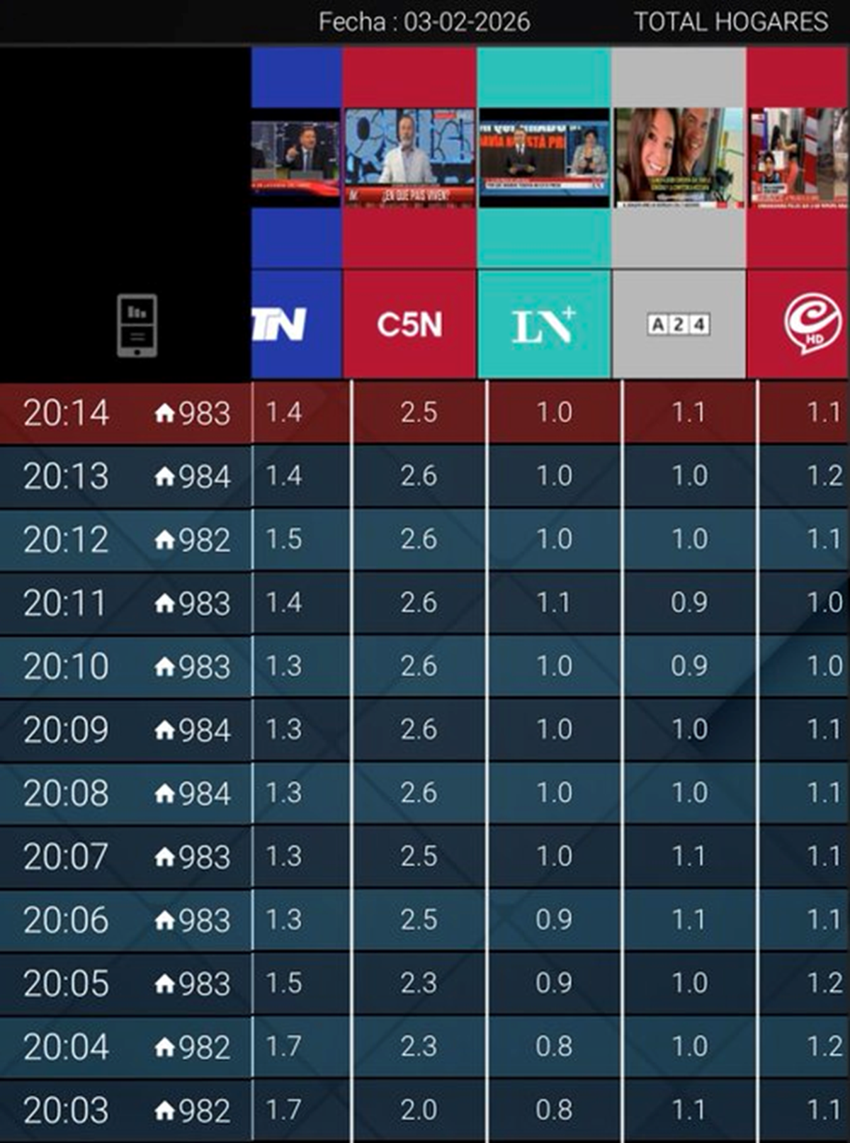 Entre los 6 canales informativos de la Argentina así quedó la puja tras la renuncia de Marco Lavagna al INDEC: en pleno horario central de las noticias: C5N casi doblaba los guarismos de TN y relegaba también a A24 al cuarto lugar y a LN+ a una lejana quinta posición.